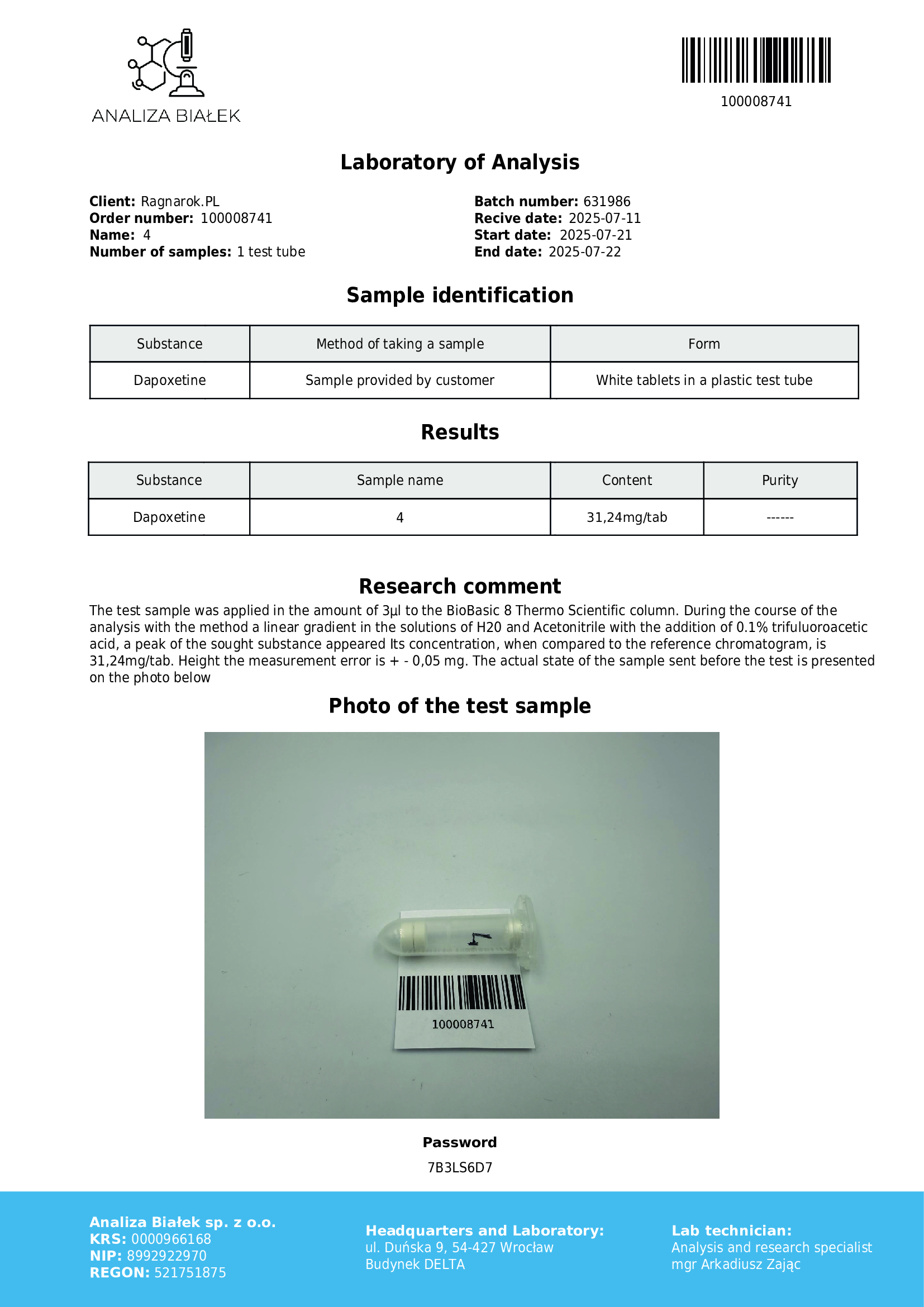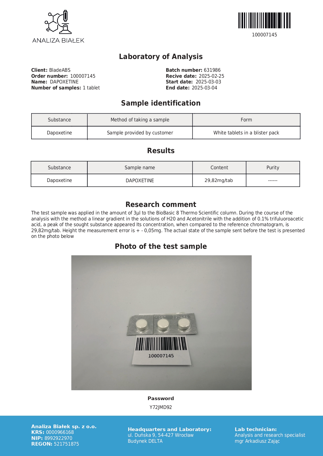 Dopo somministrazione orale, la dapoxetina viene rapidamente assorbita, raggiungendo il picco plasmatico entro 1–2 ore. La sua emivita breve (circa 1,5 ore) consente una rapida eliminazione, riducendo il rischio di accumulo e di effetti collaterali tipici degli SSRI a uso cronico (Buvat et al., 2009).