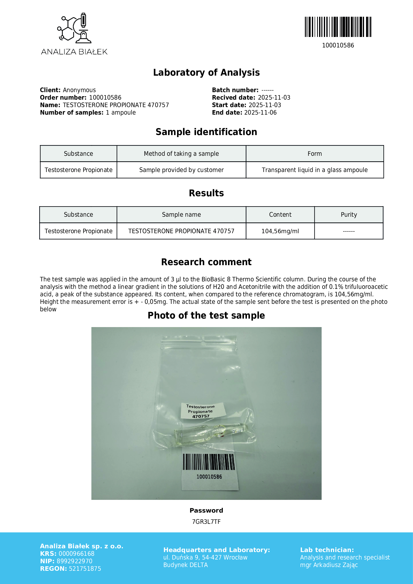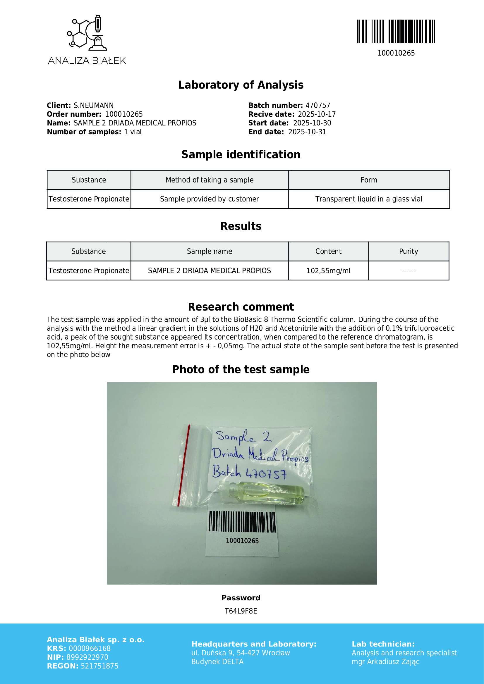 Il testosterone propionato è una forma a rapida azione del testosterone, il principale ormone sessuale negli esseri umani. Svolge un ruolo essenziale nello sviluppo dei tessuti riproduttivi maschili e femminili e contribuisce alla comparsa delle caratteristiche sessuali secondarie, come l’aumento della massa muscolare e ossea, la crescita dei peli corporei e il benessere generale.