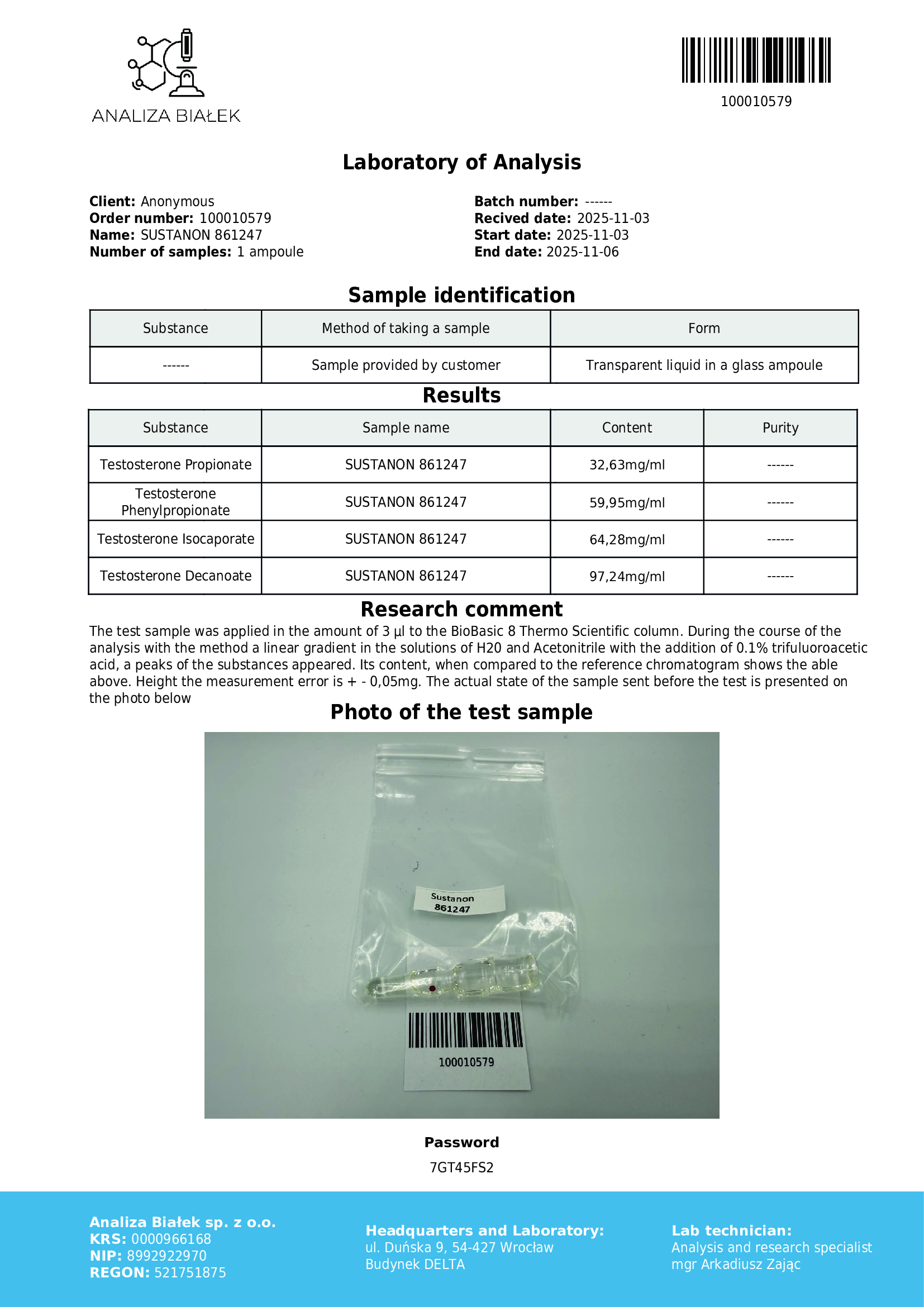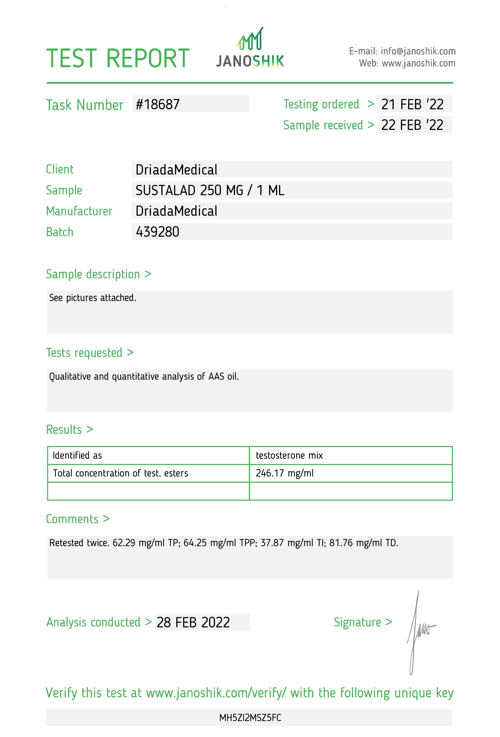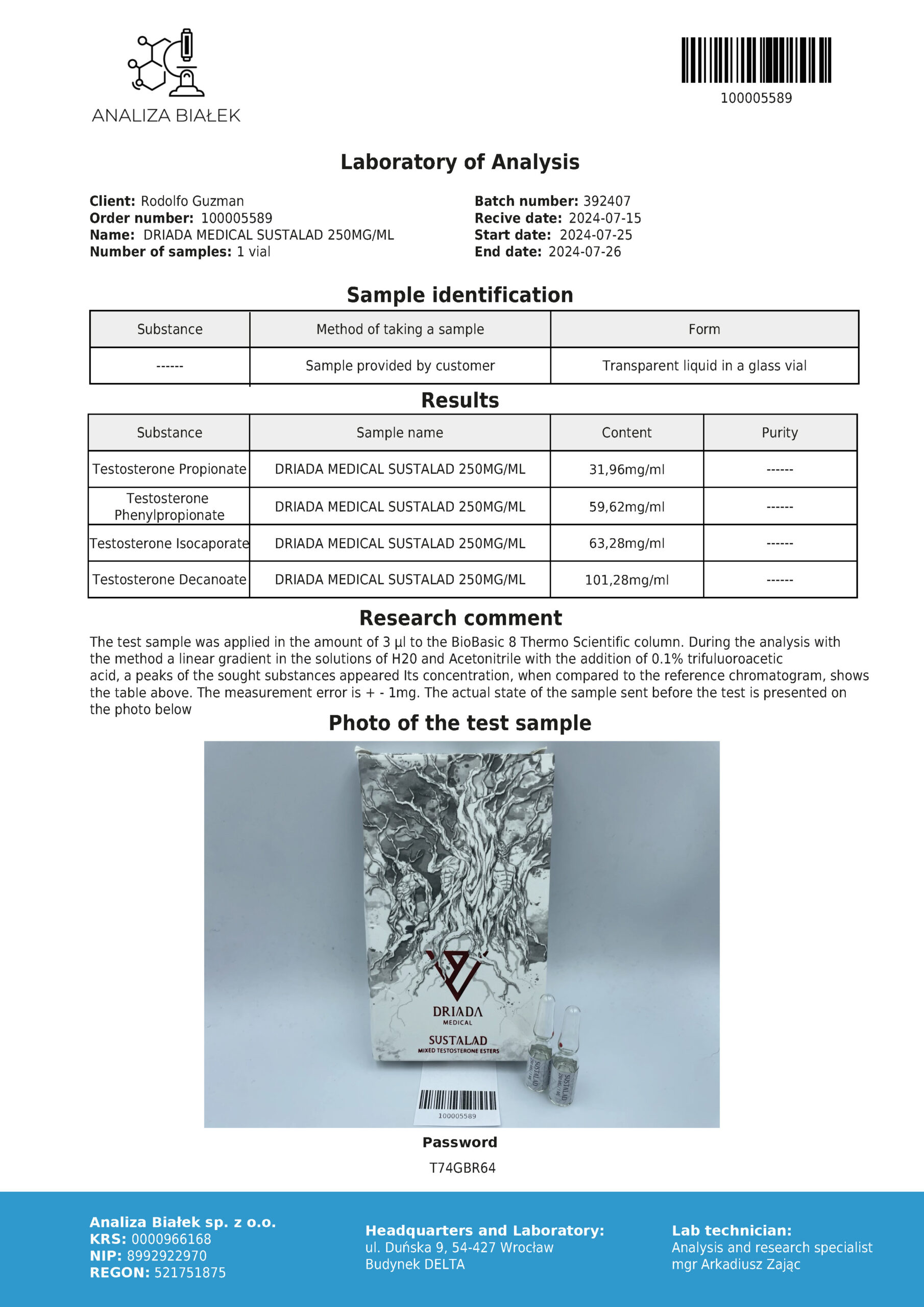 Principio attivo: Testosterone isocaproato 60 mg, Testosterone fenilpropionato 60 mg, Testosterone propionato 30 mg/ml, Testosterone decanoato 100 mg/ml